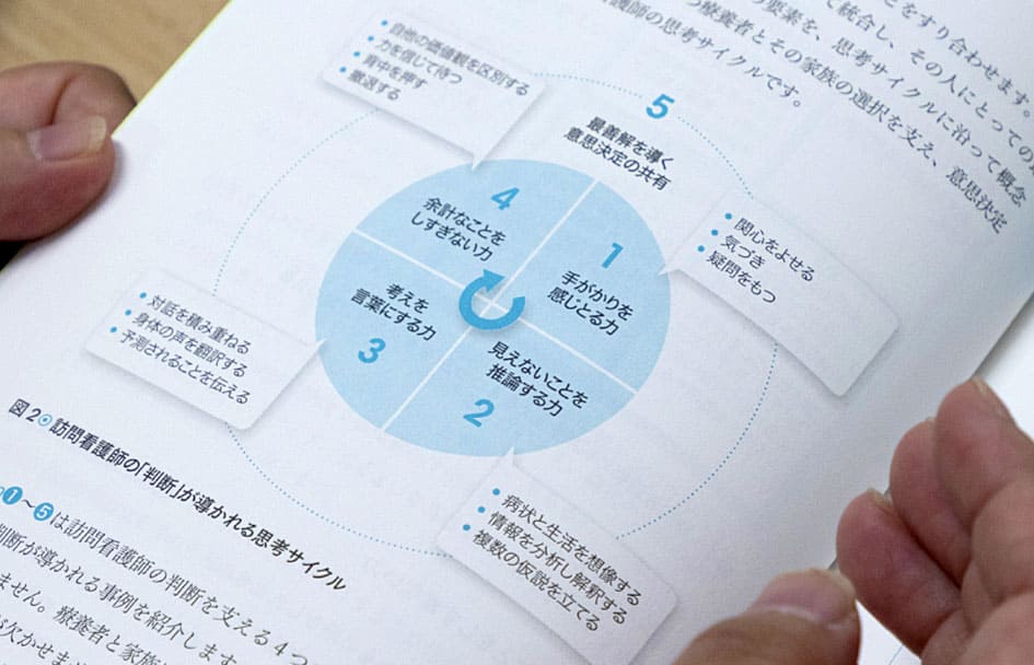 書籍では、具体的な事例を示し、紙上シミュレーションの形式で、「手がかりを感じとる力」から「最善解を導く意思決定の共有」まで学んでいけるようになっている。事例の途中には適宜「問いかけ」が挿入され、読者が考えながら、判断力をトレーニングしていけるのも特徴だ。「これを読んだ訪問看護師が、自分の思考プロセスを後から振り返る(リフレクション)ことができるよう工夫しました」と言う。